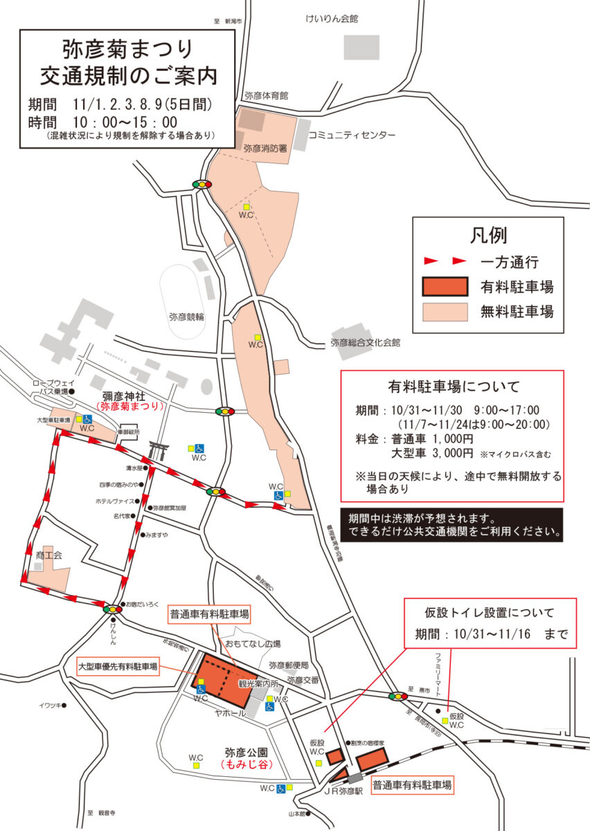 お知らせ HOME > お知らせ > 弥彦菊祭り交通規制のご案内 弥彦菊祭り交通規制のご案内 2025-10-25 お知らせ 11月1日(土)、2日(日)、3日(祝月)、8(土)、9(日) の5日間は、近隣で開催される「弥彦菊祭り」の影響で道路が混雑する可能性がございます。交通規制がかかる道路もございますので、下記の弥彦菊まつり交通規制案内をご確認ください。 投稿ナビゲーション 前の記事次の記事
