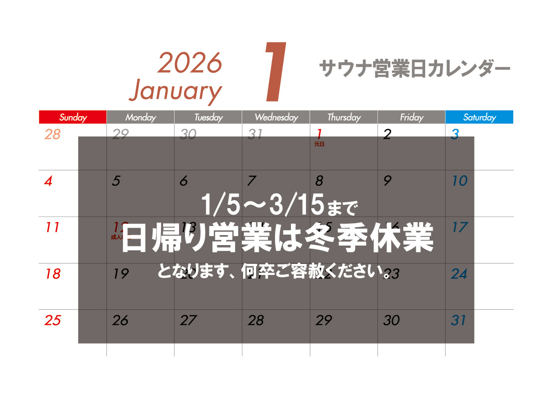お知らせ HOME > お知らせ > 日帰りサウナ 営業日カレンダー 日帰りサウナ 営業日カレンダー 2025-01-11 お知らせ 日帰りサウナの営業日は下記のカレンダーを御確認ください。 投稿ナビゲーション 次の記事