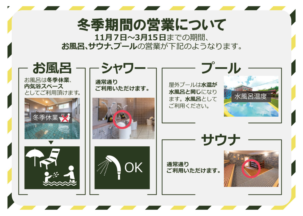 誠に勝手ながら冬季期間(11月7日~3月15日)の日帰り入浴営業を下記のように変更いたします。